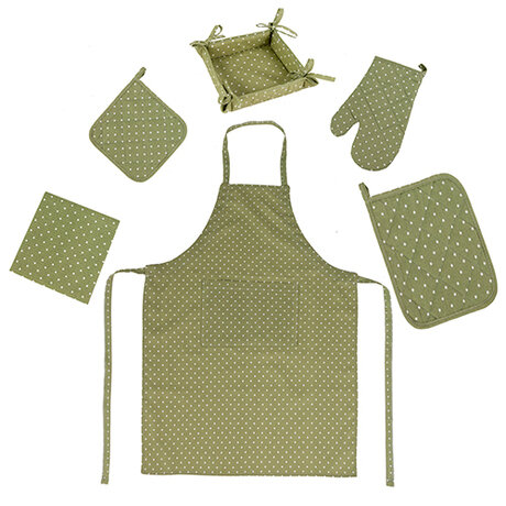 Набор для кухни 'Радушная хозяйка (Традиция)' 7 предметов (прихватка-рукавичка, прихватка, текстильная ваза, подставка под горячее, фартук, полотенце - 2 шт.), 100 % хлопок, 'Горошек олива'