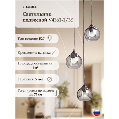Ищете стильное решение для освещения гостиной, кухни или спальни? Подвесной светильник Vitaluce V4361-1/3S с тремя стеклянными плафонами осветит до 9 кв.м пространства, создавая как функциональное, так и атмосферное освещение.Три главных преимущества: